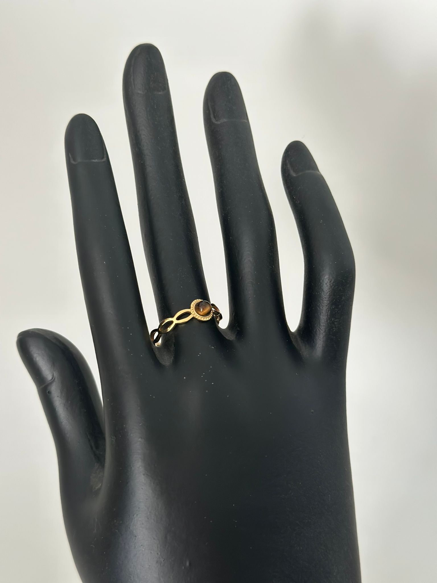 Este anillo con piedra Ojo de tigre es una pieza elegante y única que combina la belleza de la piedra natural con la resistencia del acero inoxidable. La piedra Ojo de tigre es una piedra semipreciosa con un patrón de bandas de color marrón y dorado que se asemejan a los ojos de un tigre. Se cree que tiene propiedades protectoras y curativas, y que ayuda a atraer la buena suerte y la prosperidad.