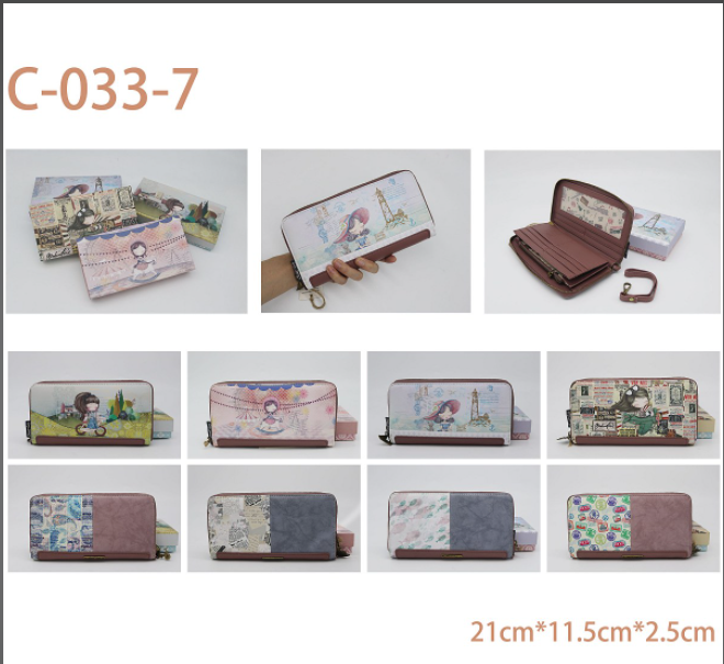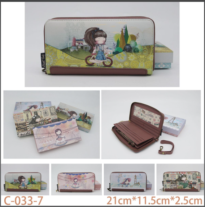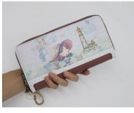 - Cartera alargada con estampado diseño muñecas, en el interior tiene varios compartimentos para tarjetas y espacio para foto.