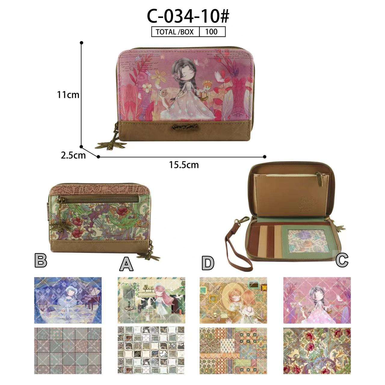 Cartera con estampado diseño muñecas, con cierre por cremallera, tiene varios compartimentos para tarjetas y espacio para foto.