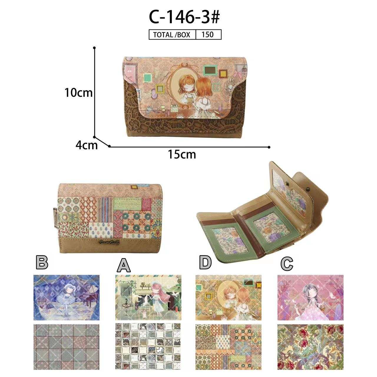 - Cartera con estampado diseño muñecas con solapa. Tiene varios compartimentos para tarjetas y espacio para foto.