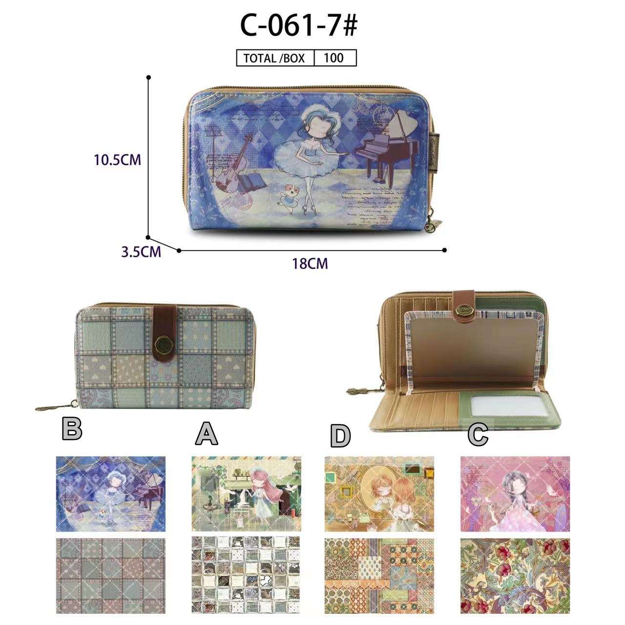 - Cartera con estampado diseño muñecas, con pequeña solada de cierre. Tiene varios compartimentos para tarjetas y espacio para foto.