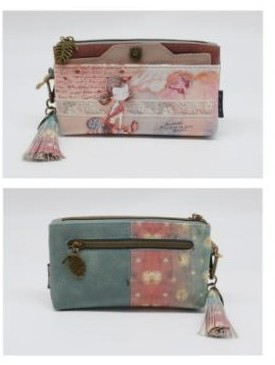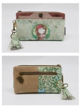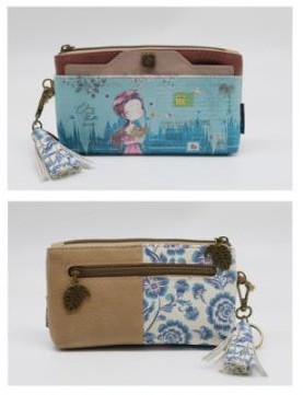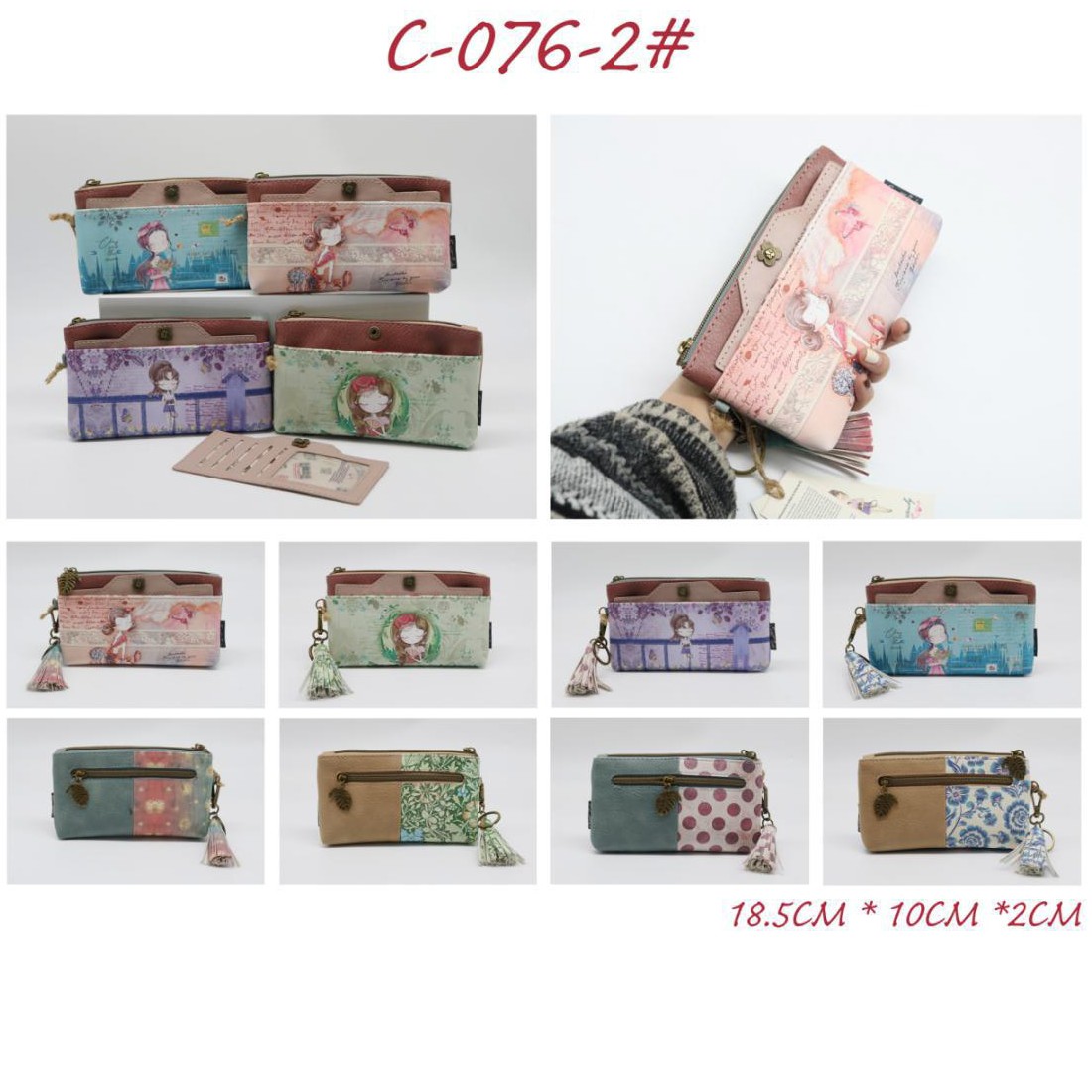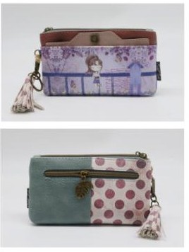 - Cartera alargada con cierre por cremallera, estampado diseño muñecas, en el interior tiene varios compartimentos y llavero.