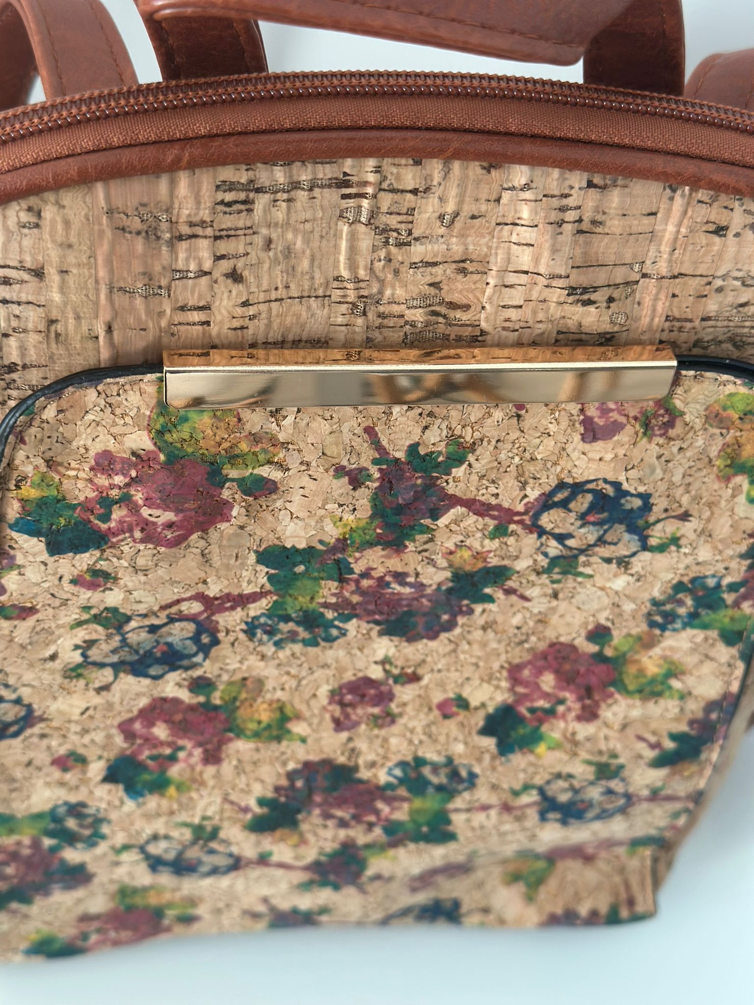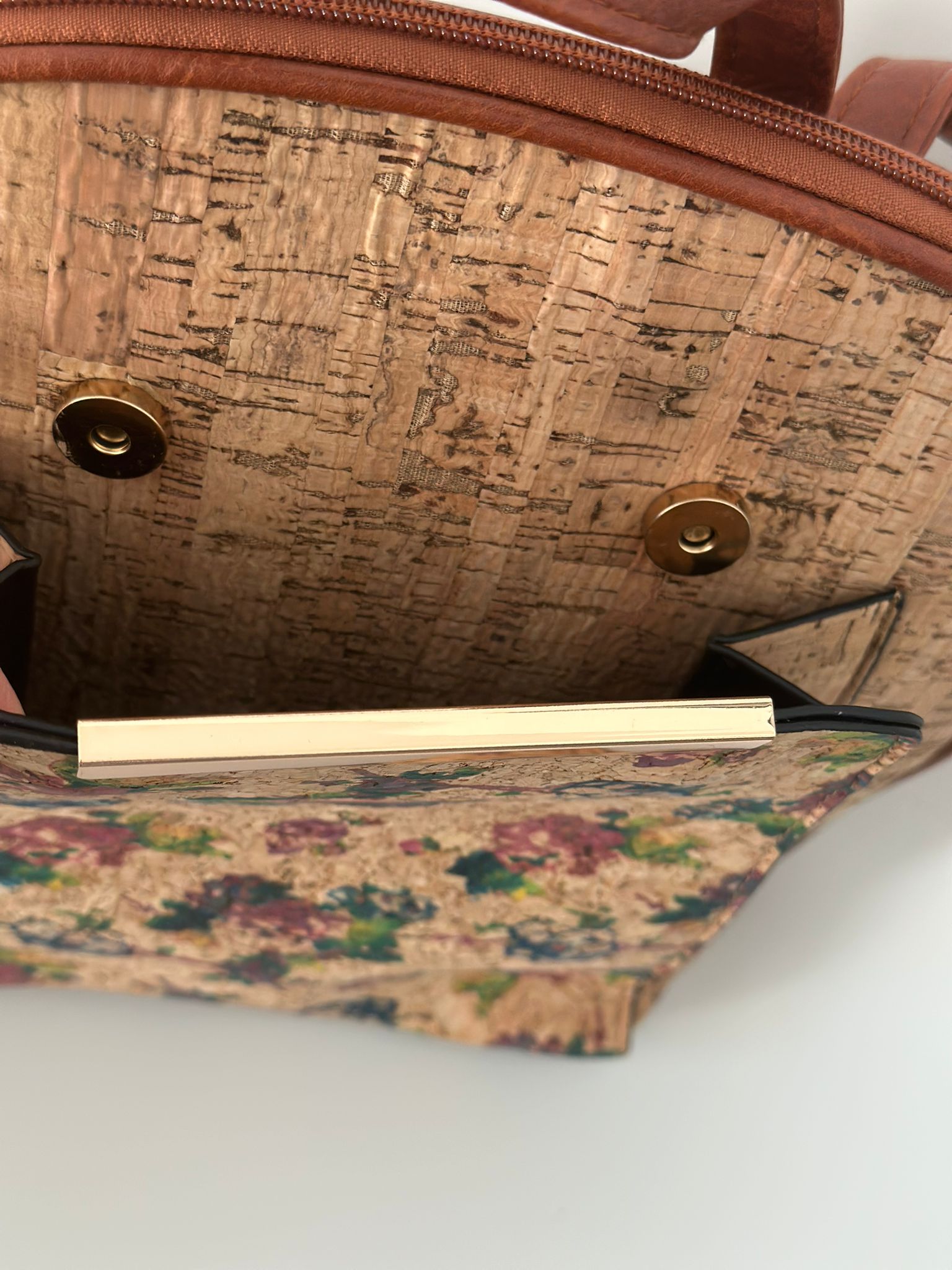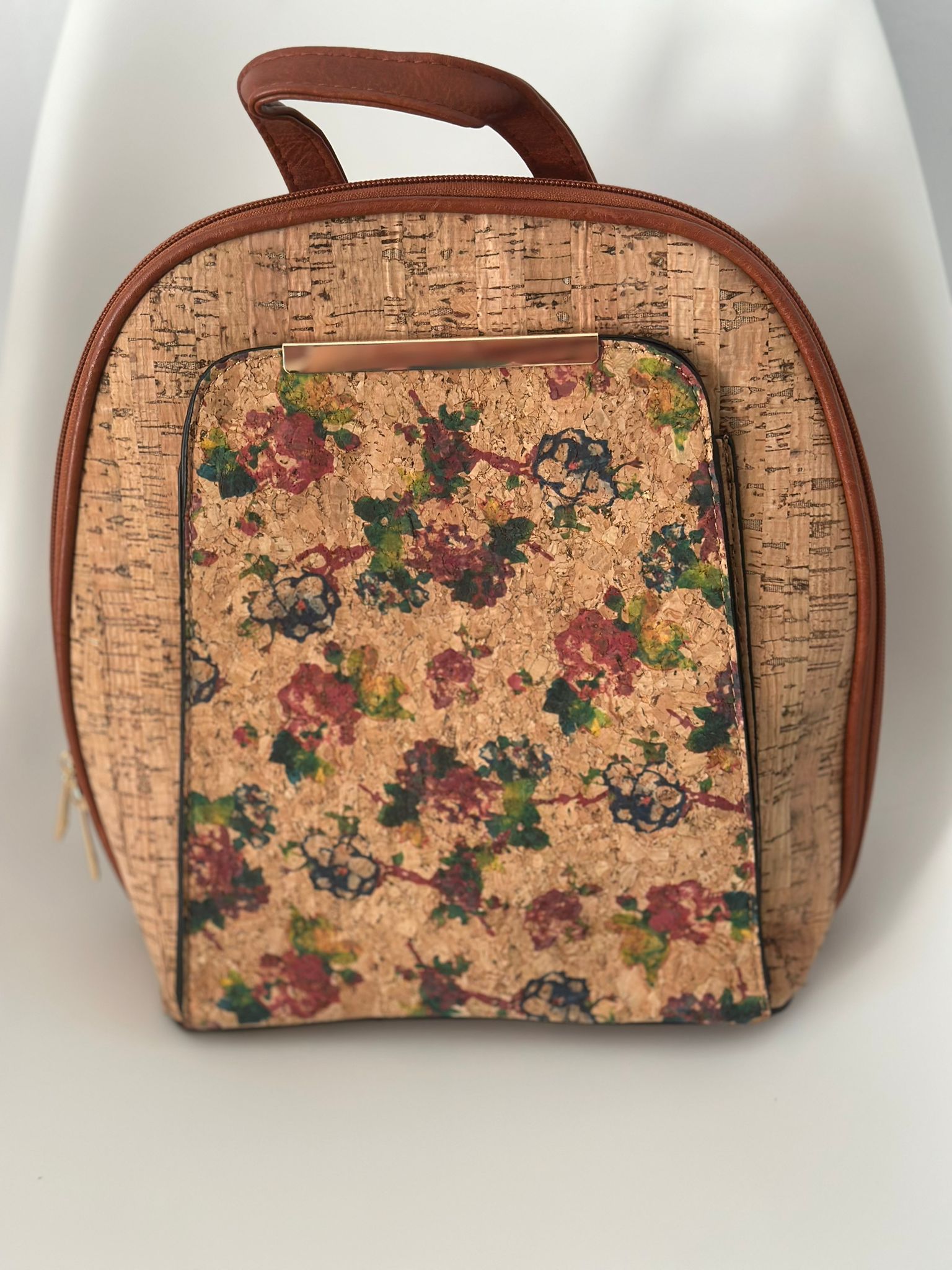 Esta mochila es perfecta para llevar todo lo que necesites, desde libros y cuadernos hasta tu tablet o pequeño portátil. Está hecha de polipiel y tela efecto corcho, un material sostenible y resistente. El estampado floral le da un toque de estilo y originalidad.