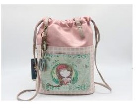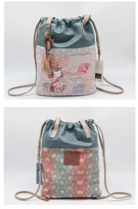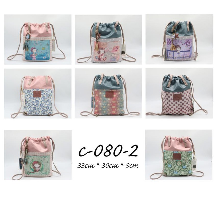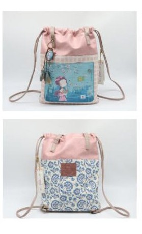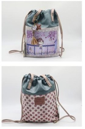 - Mochila tipo saco personaje muñeca y diseño floral.