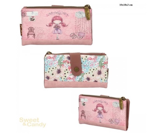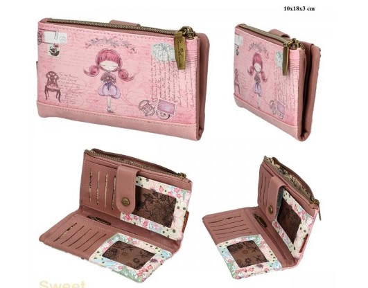 - Cartera alargada con pequeña solapa estampado floral, en el interior tiene varios compartimentos para tarjetas y espacio para foto.