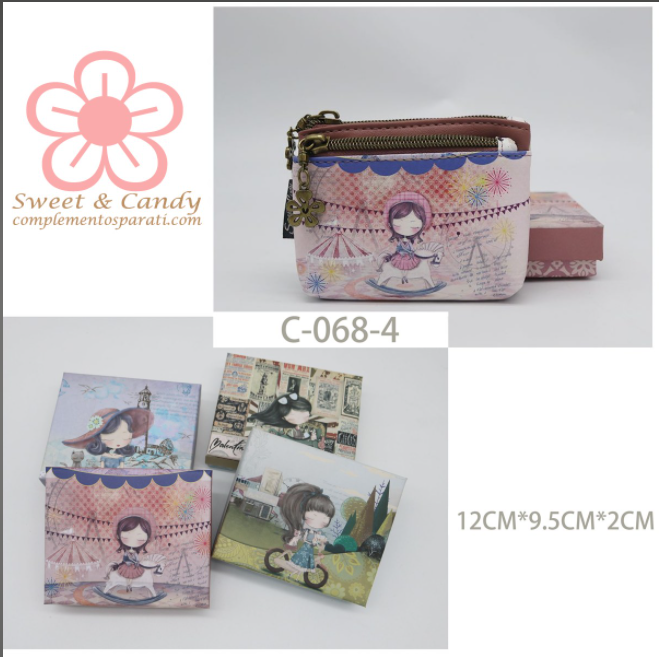 - Monedero con forma cuadrada con estampado diseño variados, cierre por cremallera y llavero.
