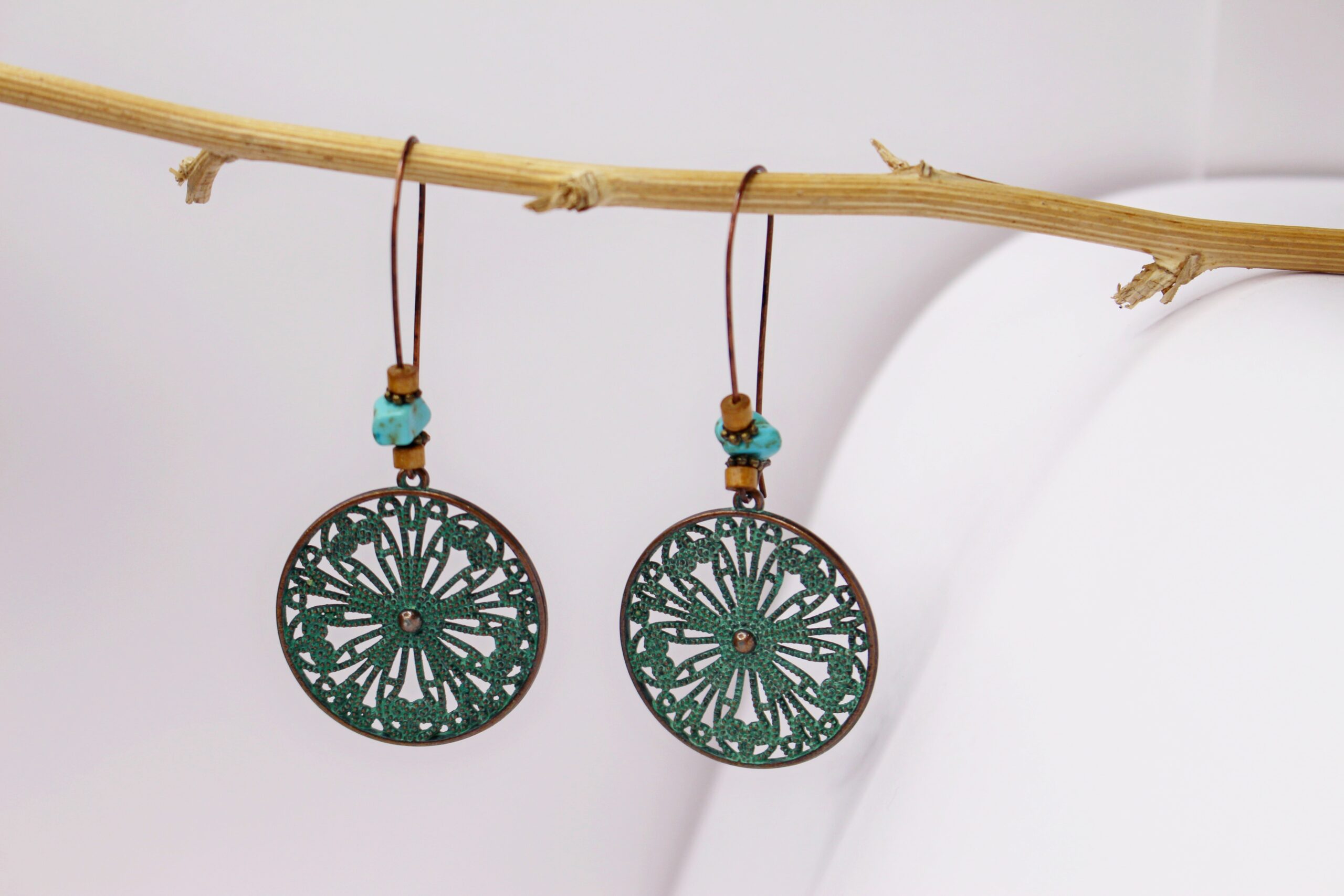 Pendientes artesanales rueda color cobrizo y verde