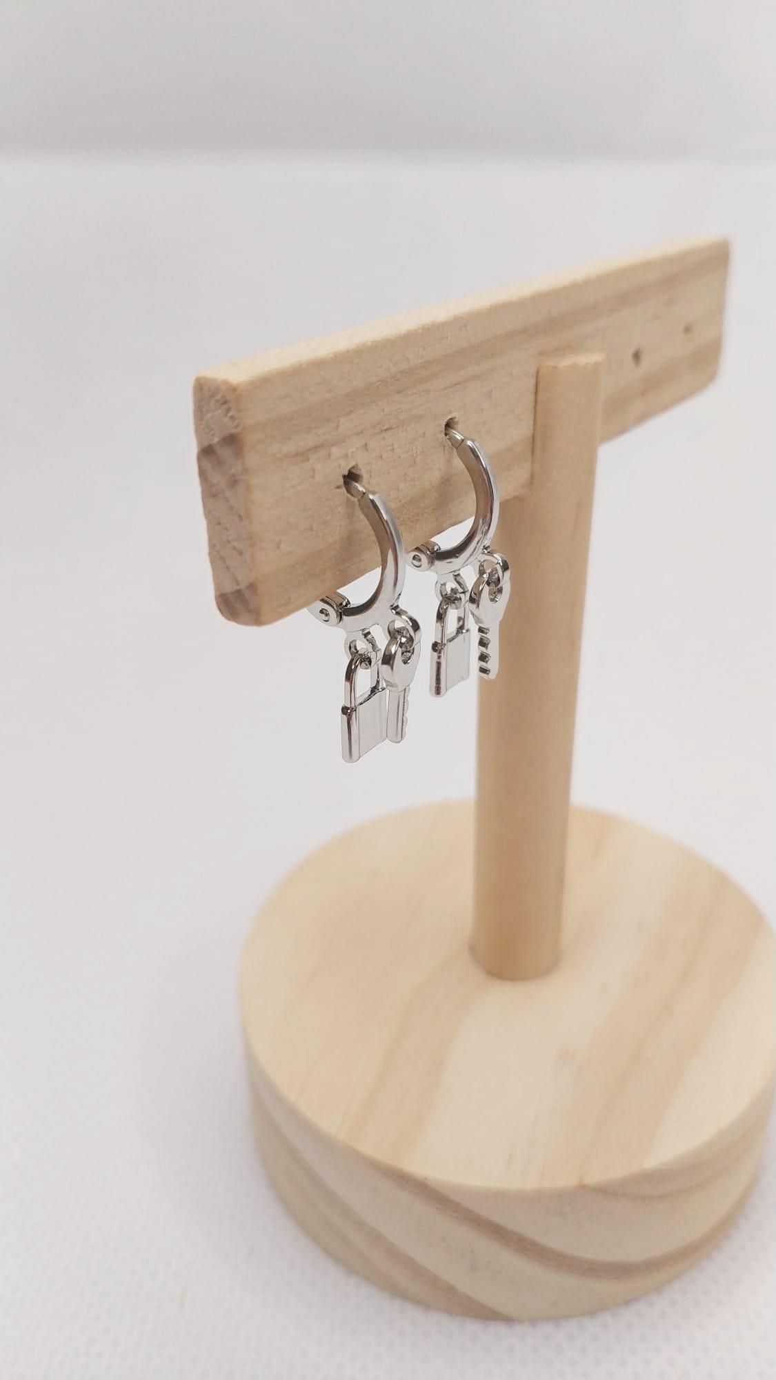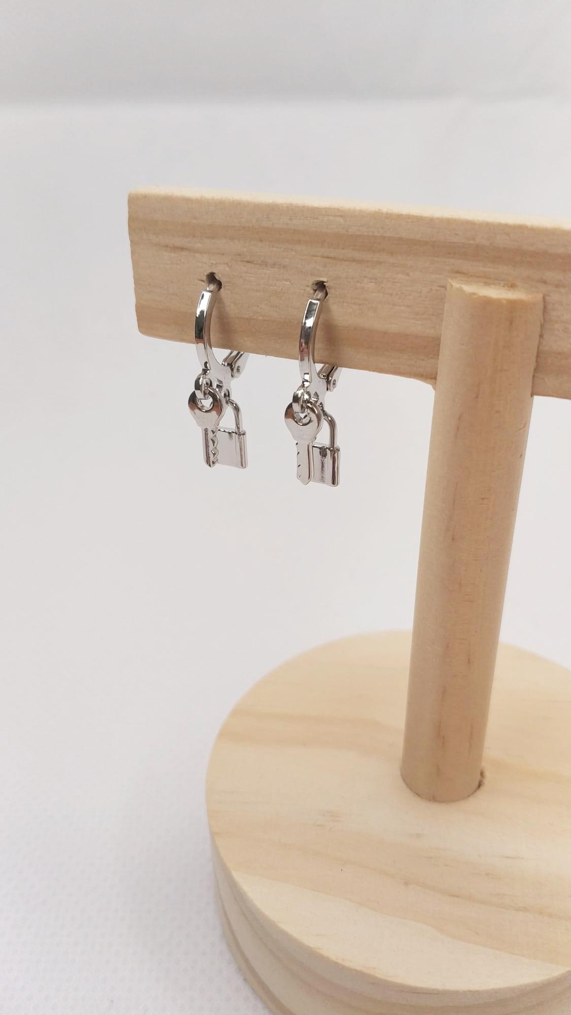 Pendientes mini aro llave y candado color plateado