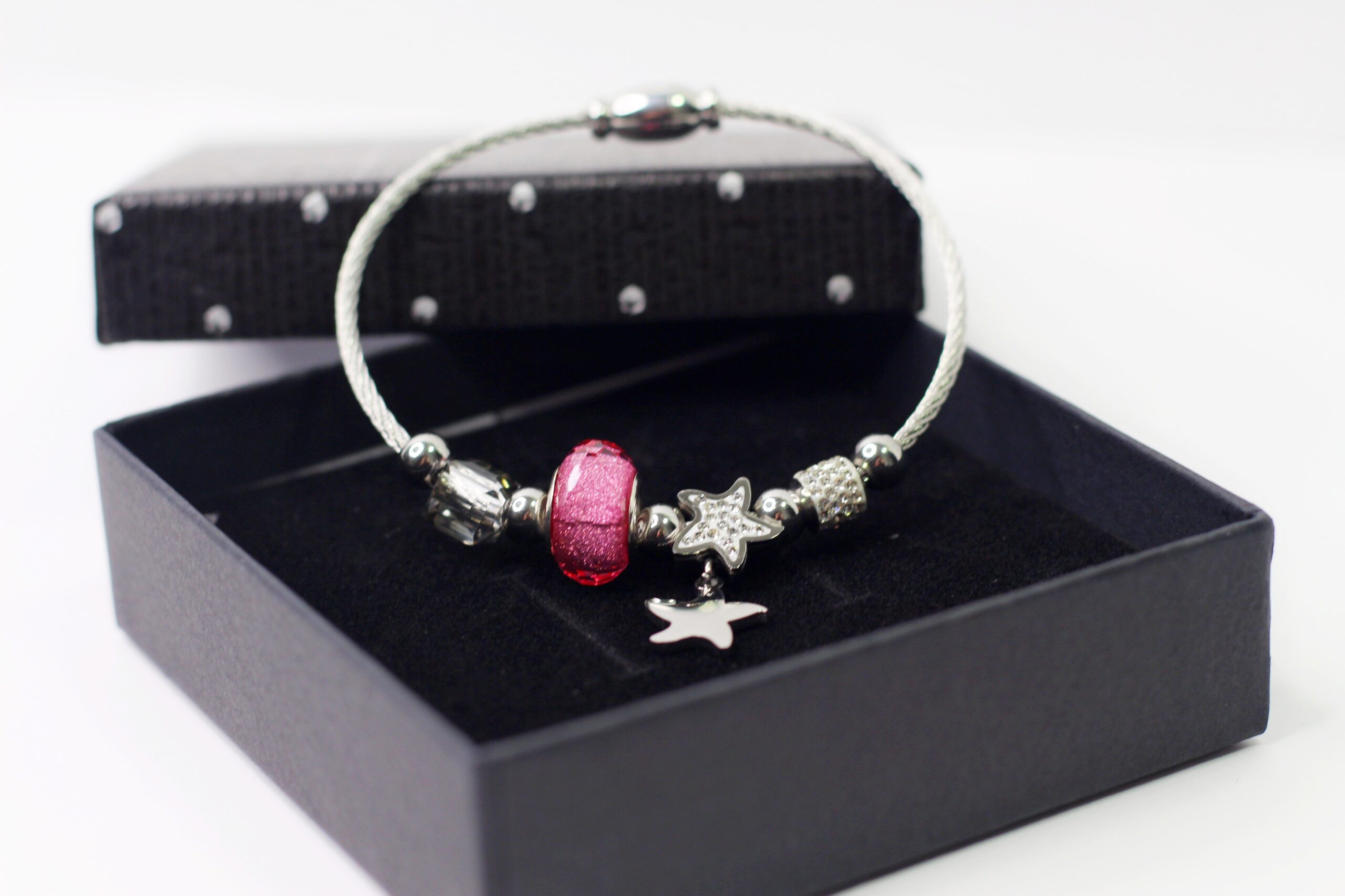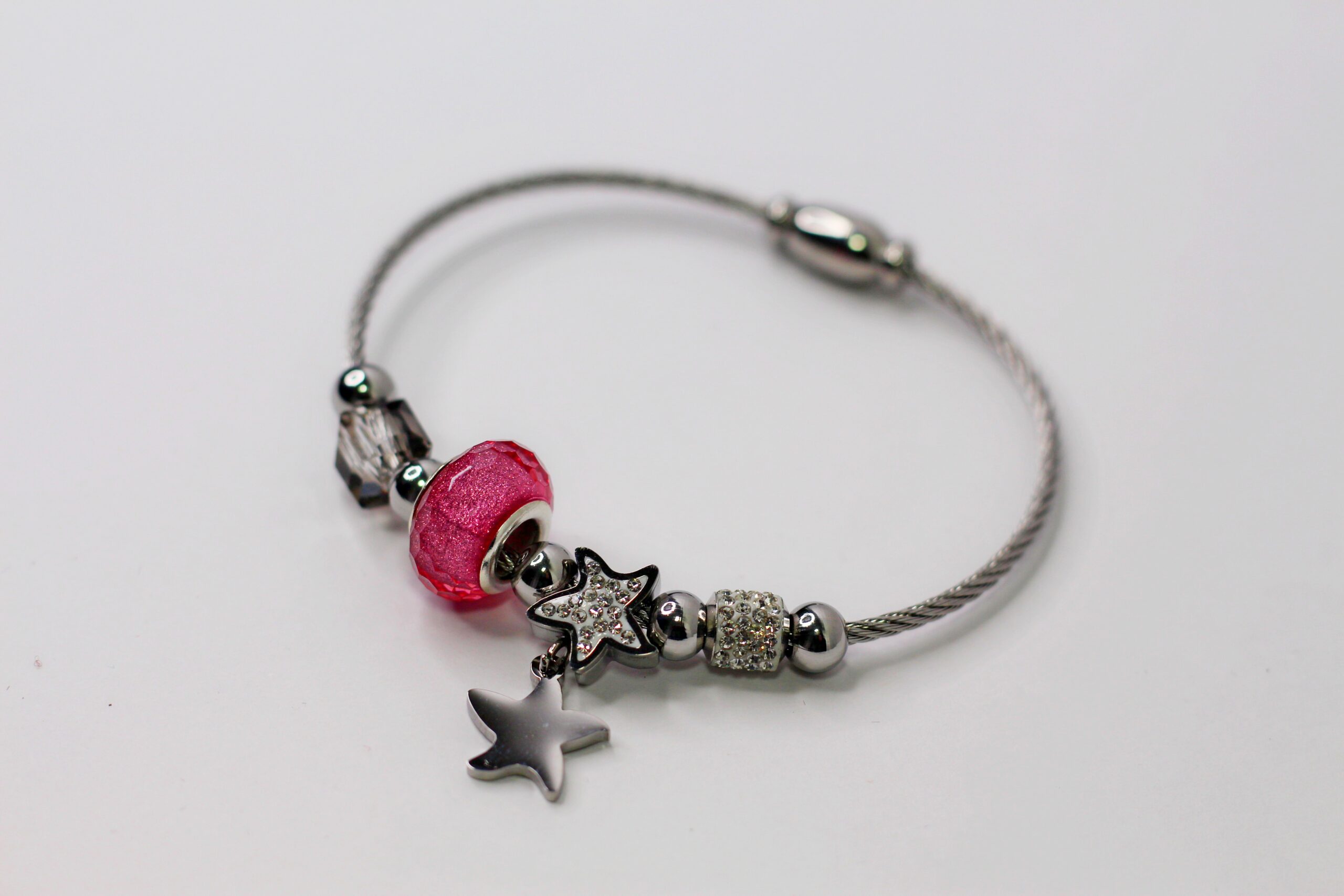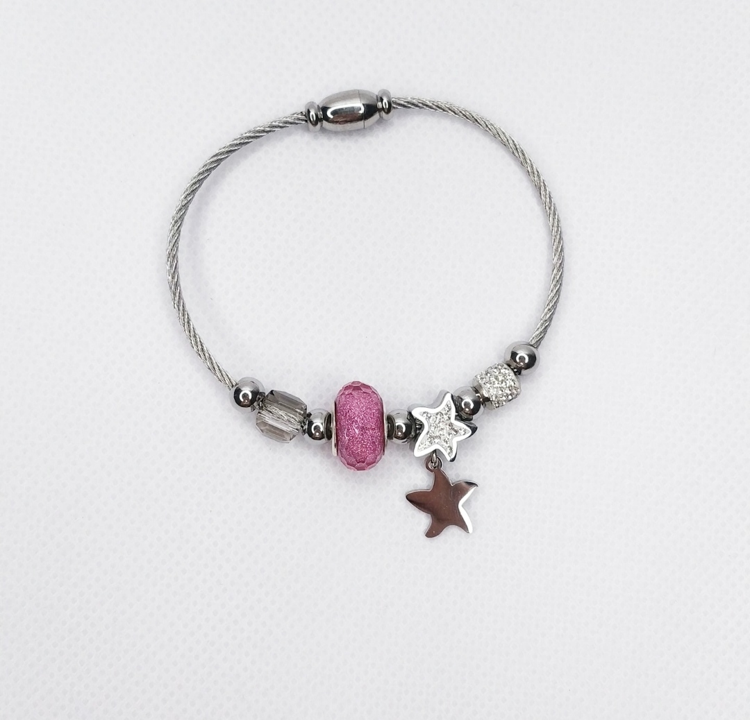Preciosa pulsera de acero inoxidable. Su cierre es de imán, fácil de poner. Parecida a otras de marcas famosas. Resalta su abalorio con purpurina rosa.