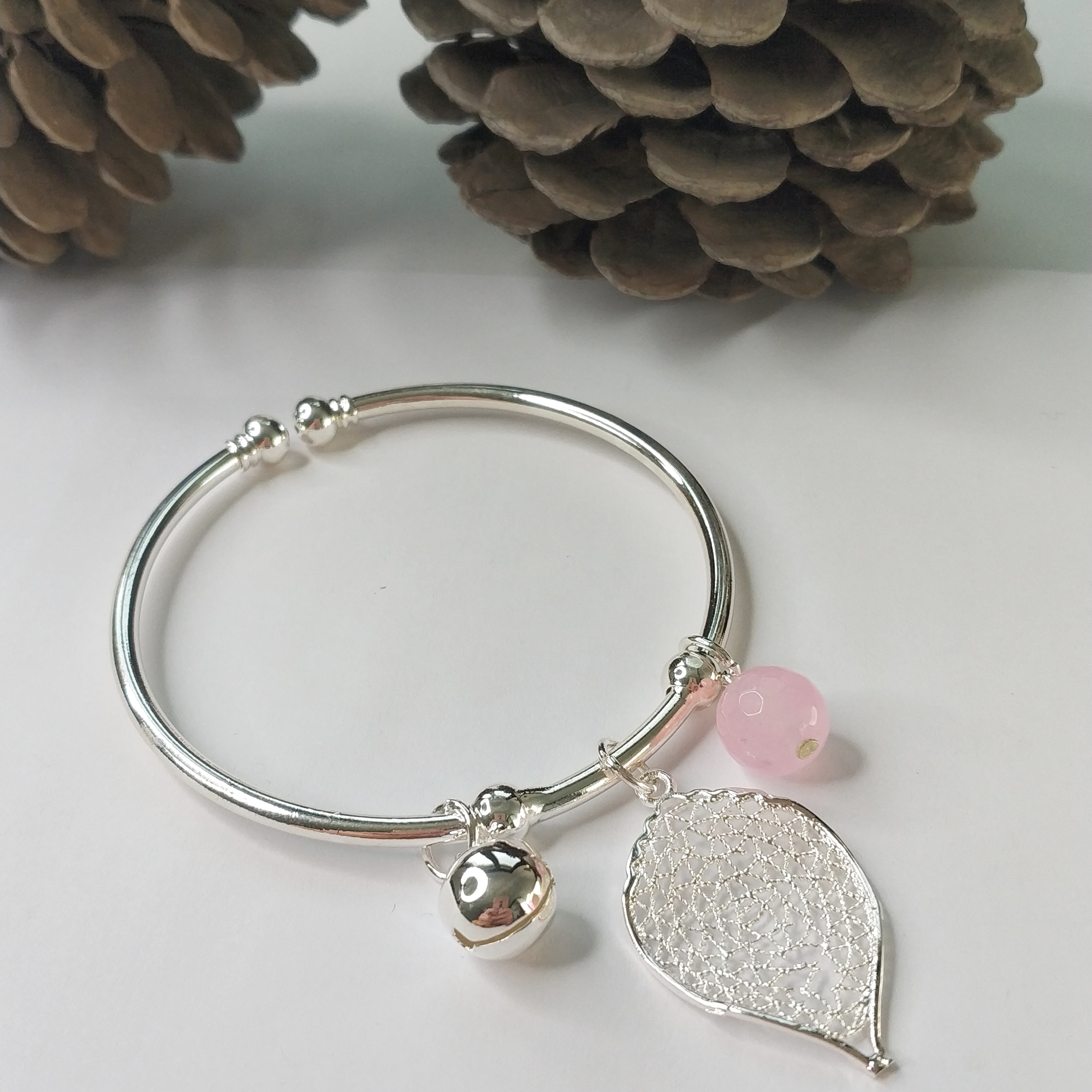 PULSERA COLOR PLATA DETALLE HOJA Y BOLITA ROSA
