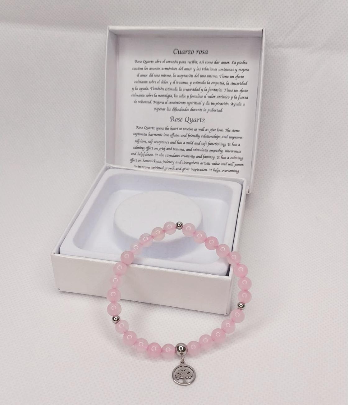 Pulsera cuarzo rosa con detalle árbol de la vida