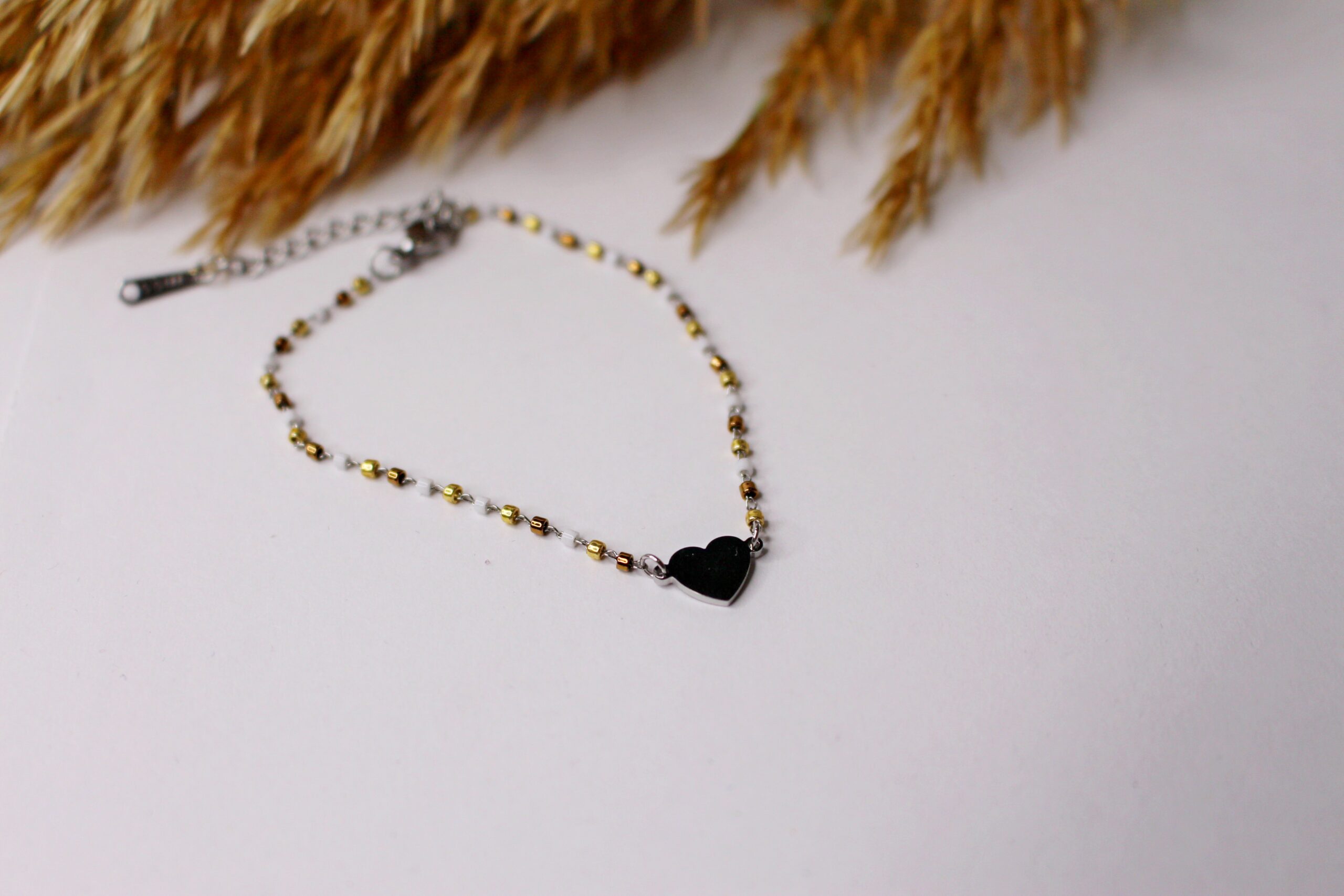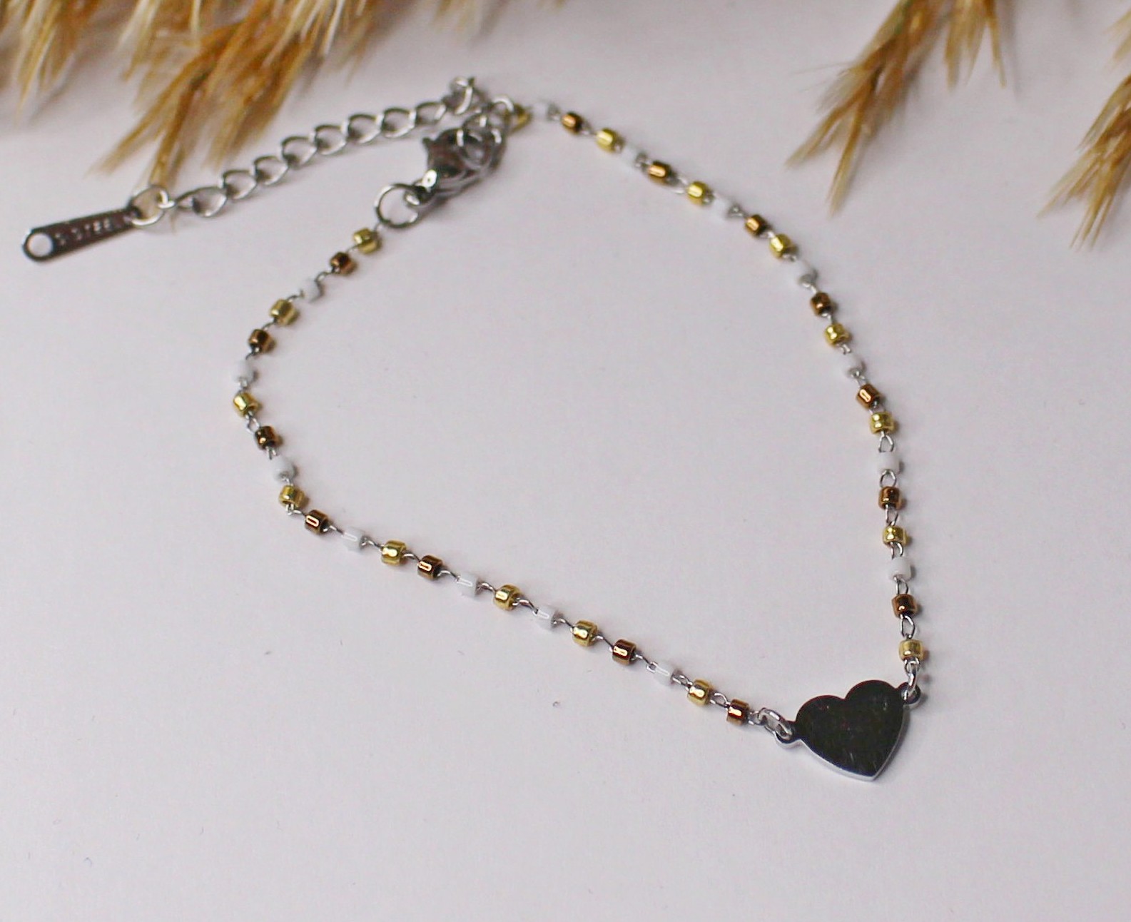 Pulsera plateada con detalle de corazón y tonos dorados.
